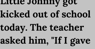 FUNNY • Uncategorized Little Johnny got kicked out of school today. The teacher asked him, “If I gave you twenty dollars. And you paid five dollars to Kate, five dollars to Sally and five dollars to Linda. What would you have? 2 years agoAdd Comment